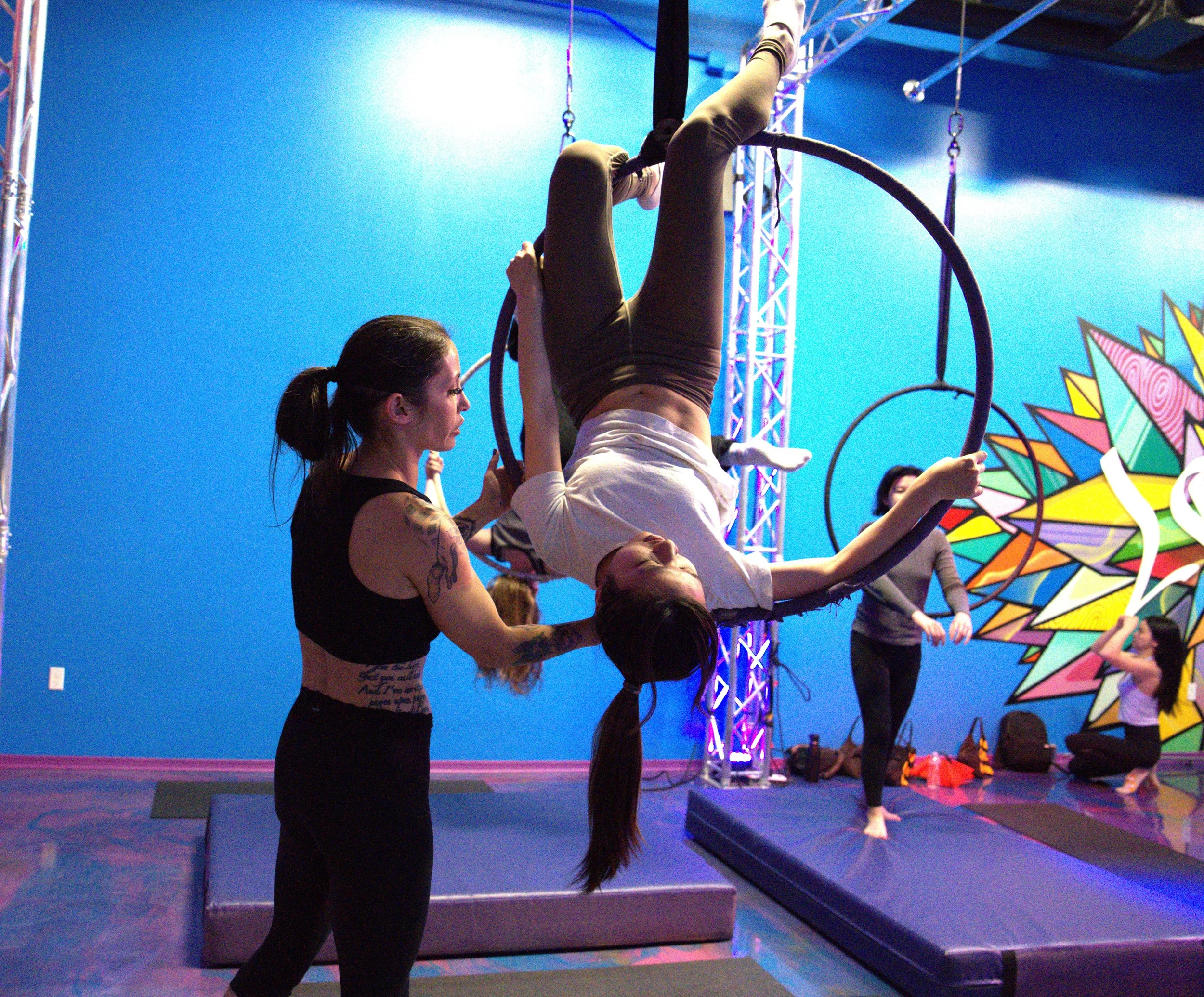 If you have never taken Aerial Hoop and are new to other aerial apparatus, or if you want to polish your techniques and skills, this class is for you. Your instructor will begin class by leading you through a series of strength and conditioning exercises that will help prepare you to later on transition into the air. After that, you will learn a sequence of tricks and transitions on this Aerial Hoop.